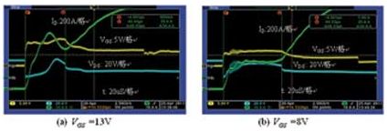 在不同的柵級電壓下測量短路電流,測試波形如圖2所示,采用的功率MOSFET為AOT266。圖2(a):VGS電壓為13V,短路電流達1000A,MOSFET在經(jīng)過47μs后電流失控而損壞;圖2(b):VGS電壓為8V,短路電流僅為500A,MOSFET在經(jīng)過68μs后電流失控而損壞。電流測試使用了20:1的電流互感器,因此電流為200A/格。