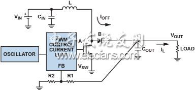 使用肖特基二極管代替開關(guān)B的調(diào)節(jié)器定義為異步 (或非同步), 調(diào)節(jié)器,而使用FET作為開關(guān)B的調(diào)節(jié)器定義為同步調(diào)節(jié)器。圖3中,開關(guān)A和B已分別使用內(nèi)部NFET和外部肖特基二極管來實(shí)施,從而形成異步升壓調(diào)節(jié)器。對于需要負(fù)載隔離和低關(guān)斷電流的低功耗應(yīng)用,可添加外部FET,如圖4所示。將器件的EN引腳驅(qū)動(dòng)至0.3 V以下便可關(guān)斷調(diào)節(jié)器,使輸入與輸出完全斷開。