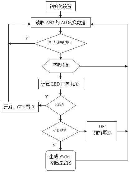 PIC12F675初始設置GP4輸出高電平,如測得LED正向電壓在合理范圍內,則維持高電平輸出使LM3404正常工作;如LED正向電壓逐漸變低并低于設定值18.68V,則在GP4引腳輸出PWM信號,其占空比可依次降低,直至LED正向電壓低于設定值。當測得LED正向電壓很高時可判定輸出開路, PIC12F675可輸出低電平關閉LM3404的輸出。