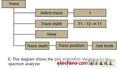 用于頻譜分析器的功能序列顯示在圖6中。線跡1設定為計算“線跡1”減去“線跡2”,后者包含了輸入功率。這樣,新獲取的輸出功率將提供一個以dB為單位的增益圖。“線跡位置”特征被用作獲得直接讀取以dB為單位的絕對增益的一個偏差。線跡偏差被設置為“輸出偏差”減去“輸入偏差”。這種情況下,“輸入偏差”在校準階段被確定為30.7dB,結果得到偏差值為13dB。該值不能直接作為以dBm為單位的偏差值加入,因為“線跡位置”清單只接受作為Y刻度百分比的輸入。旋轉鈕用來獲取與13dB偏差值相對應的正確百分比。圖7中的藍線即為所得。