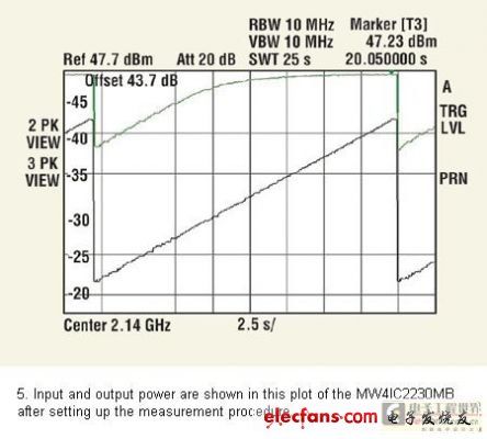 用于頻譜分析器的功能序列顯示在圖4中。此刻,頻譜分析器連接到輸入,且輸入功率在第二條線跡(線跡2)獲取,并保持在“觀察”模式。圖5中的黑色線跡即得。當在輸出再連接分析器之后,從第三條線跡(線跡3)獲得輸出功率,同樣也保持在“觀察”模式。通過設置“輸出偏差”值的參數等級偏差,該值在校準階段被設為43.7dB,從“線跡3”可以直接讀取以dBm為單位的絕對輸出功率,圖5中的綠線即得。通過在鋸齒末端的平面區域安置標記,可以讀取如圖5 中綠線所示的飽和功率。MW4IC2230MB顯示+47.23dBm的飽和功率。