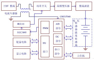 該方案中開關電源的最大輸出功率為2.6KW,交流輸入范圍為l70V-270V,充電器電路主要包括主充電電路和單片機控制電路兩部分,整個電路的工作過程為:220v單相交流電經過全橋整流由電容進行濾波.得到約300v左右的直流電.經過由4只IGBT構成的逆變橋,得到高頻交流電,經高頻變壓器耦合到副邊.再經過整流管D6,D7整流。最后經過電感L3和電容C7濾波后得到穩定的直流輸出。由于采用智能充電,根據不同的電池每個階段充電電壓和充電電流都不同。所以使用cygnal公司的C8051040F單片機作為充電過程控制設備,充電時單片機檢測充電電池的充電電流,充電電壓,電池溫度,防止電路過壓和過流。電池溫度過高,還可以通過檢測電池電壓電流值來決定是否在切換到下一個的充電階段。同時通過單片機給出每一階段的充電的電壓值或是電流值,與采樣所得的對應電壓電流值相比較。通過移相控制芯片uCC3895改變PWM值來改變功率管的導通時間.達到在不同電池不同階段得到不同穩定的輸出值的目的。