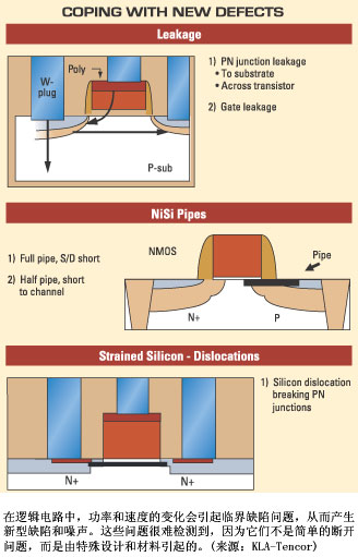 涉足尖端技術研究工作的芯片制造商正在把無數新材料和奇特的器件結構結合起來,用于65nm及更低節點的量產。同時他們發現,在這些研究上的努力生產的結果還包括目前必須著手解決各器件各個層上出現的越來越多的細微的電缺陷和微小物理缺陷。在存儲器中,可能會出現多晶硅阻塞管道問題poly-plug piping problems,從而引起BPSG(硼磷硅酸鹽玻璃)孔隙問題。在邏輯領域,使用應變硅引起的應變硅位錯可能產生缺陷,有時這類缺陷直到后道工藝才顯露出來。