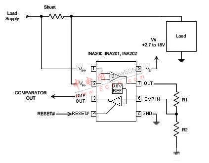 在許多應(yīng)用中,電流應(yīng)與某個設(shè)定值相比較。通常說來,進(jìn)行電流比較還需要電流分路.、比較器和參考電壓。此外,理想的比較器輸出應(yīng)與大多數(shù)常見的邏輯電路很好地兼容。圖 5 給出了電流比較的例子。在本例中,將電流與采用 TI INA200 系列電流分路.和比較器的簡單單電壓結(jié)點進(jìn)行了比較。R1 和 R2 形成分壓器,以根據(jù) INA200 系列比較器的內(nèi)置 0.6V 電壓結(jié)點來設(shè)置電壓結(jié)點。(INA200 系列的增益很有特點:INA200 的增益為 20,INA201 的增益為 50,INA202的增益為 100。)