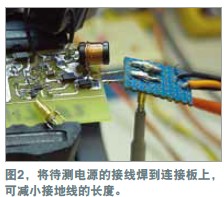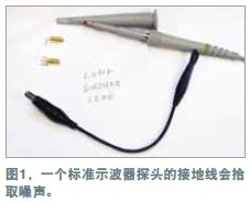 在測量電源軌的紋波時,必須盡量減小噪聲,因為紋波幅度可能很小。示波器探頭是基本的測量工具,但它們可能引入噪聲與誤差。地線(如與標準示波器探頭連接的那根線)可能增加一些不會出現在示波器軌跡上的電路噪聲。線路環就像一根天線,會提取周圍的雜散磁場。環路面積越大,提取的噪聲就越多。為證明這個理論,可將示波器地線連接到探頭尖端,然后到處移動。示波器會隨著地線的移動而顯示出噪聲的增減。用一個示波器探頭及其地線和插座可以做一個簡單的連接板(圖1)。