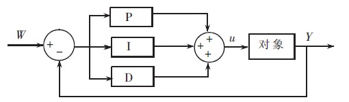 PID 控制原理如圖2 所示。PID 控制是一種線性調節器, 它把設定值W 與實際輸出值相減, 得到控制偏差e .偏差值e 經比例、積分、微分后通過線性組合構成控制量U, 對對象進行控制。其中比例調節器起到基礎調節作用, 主要對控制系統的靈敏度和控制速度有影響。積分調節器可以自動調節控制量, 消除穩態誤差,使系統趨于穩定。微分調節器可以減小超調, 克服振蕩, 同時加快系統的穩定速度, 縮短調整時間, 從而改善系統的動態性能。