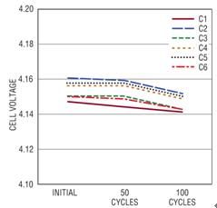 電池組 1 經過了 100 個充電 / 放電周期,圖 3 顯示若干周期后記錄 6 節電池的電壓。該圖顯示,經過短暫停頓后,在一個完整的充電周期結束時所測得的電池電壓。充電后,電池電壓之間的不平衡與容量和內部電阻的小量變化有關。在第一個完整的周期中,測得的電池組容量為 2.072AHr,經過 100 個周期后,所測得的容量為 2.043AHr,隨著周期數增加,容量有少量下降。還有一種趨勢,即隨著充電 / 放電周期數的增加,充電后電池的最終電壓下降了,100 個周期以后,這種趨勢尤其顯著。這種趨勢最有可能是因為電池老化引起電池內部電阻的小量增加導致的。內部電阻增加使電池更快地達到充電結束門限。盡管在工作時沒有平衡,這個電池組在 100 個周期中自始至終保持著同樣程度的不平衡。能像這個電池組一樣,每節電池自然而然相互匹配的電池組相當罕見。