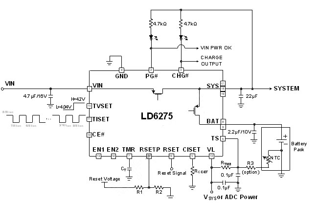 為滿足低耗電可攜式產(chǎn)品對(duì)于更精確、更安全的充電器應(yīng)用需求,許多IC制造商發(fā)展出低成本線性充電器。圖2是以通嘉科技的LD6275充電IC為設(shè)計(jì)范例,構(gòu)成僅需少數(shù)外部零件的獨(dú)立式線性充電器電路,其具備1.5A的最大充電電流。