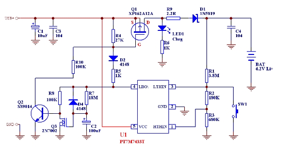 PT7M7433T是上海百利通公司最新設計的極高精度的一系列電壓檢測器的其中一款,其檢測精度在0-Vcc (5.5V)范圍內小于1mV,而且其批量IC的檢測值偏差<±2.5%,這樣完全保證了批量產品的性能一致性和極高的總體性能,我們利用其配合少量外部電路即可組成相當簡單的鋰電池充電線路。