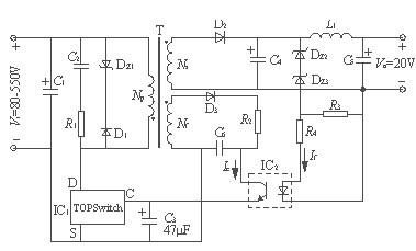 第七步確定反饋繞組的參數(shù),反饋是反激的電壓,其電壓是取自輸出級的,所以反饋電壓是穩(wěn)定的,TOP 的電源電壓是5.7到9V,繞上7匝,那么其電壓大概是6V多,這就可以了,記得,反饋電壓是反激的,其匝數(shù)比要和幅邊對應(yīng),懂什么意思嗎,至于線,因為流過其的電流很小,所以就用繞原邊的線繞就可以了,無嚴格的要求.