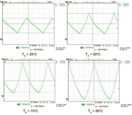圖4左上圖顯示了在飽和點以下工作的電感器,具有正常的三角電流波形,可由(V/L×Δt)算出。在峰值電流保持相同且溫度升至50℃(右上圖)時,電感電流斜率開始增至1.76A標記附近,指示顯示電感器的飽和點隨著溫度上升而向下移動。當溫度升到70℃, 然后升到85℃時,隨著電感器達到飽和整個電流波形最終出現(xiàn)。