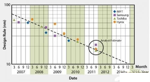 圖1:NAND閃存技術的制造工藝幾何尺寸變化趨勢。