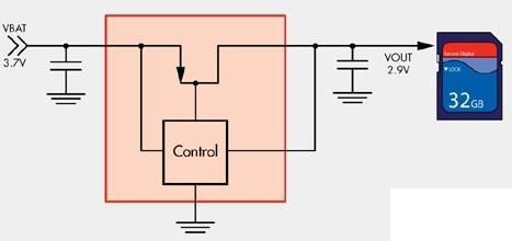 對于低速工作的小容量SD卡,耗電量常常小于100mA。假設鋰離子電池的額定工作電壓為3.7V,且存儲器的電源軌相當高,則線性調節器就成為SD存儲器的電源選擇。不過,選定的線性調節器必須能以低壓降(LDO)方式工作,因為鋰離子電池的有效電壓范圍在3.2至4.2V之間。