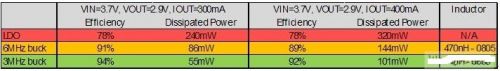 表1: LDO與 6MHz降壓轉換器和3MHz降壓轉換器的電源效率與功耗對比。