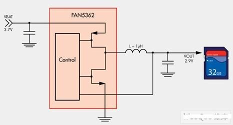 圖4:FAN5362降壓轉換器實現2.9V SD卡的供電電路。