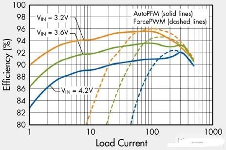 按照表1的計算,對于300mA的系統,FAN5362能把功耗降至55mW;對于400mA的系統,FAN5362能將功耗降至101mW。這些效率值根據所測得的FAN5362效率曲線而獲得。圖5顯示了AutoPFM(實線) 和 ForcePWM (虛線)的效率曲線。在優化FAN5362效率的同時,選擇3MHz作為額定開關頻率,因為它能夠提供尺寸和效率之間的最佳權衡。從表1可看出,對于這種功耗敏感應用,采用6MHz開關頻率時的功耗遠遠大于采用3MHz開關頻率時的功耗。