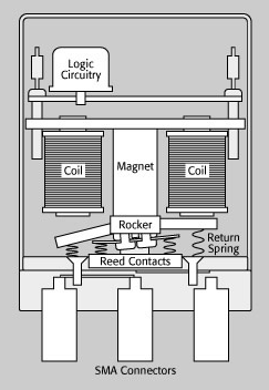 繼電器內(nèi)的容性是限制開關(guān)的信號頻率的常見因素。繼電器的材料和物理特性決定了其構(gòu)成的內(nèi)部電容。比如,在超過40GHz的射頻和微波開關(guān)中,在機電繼電器中采用了特殊的接觸架構(gòu)來獲得更好的性能。圖1顯示了一個典型的構(gòu)造,共同端接位于兩個開關(guān)端接之間。所有信號的連接線路都是同軸線,來保證最佳的信號完整性(SI)。在這種情況下,連接器是SMA母頭。對于更加復雜的開關(guān)結(jié)構(gòu),共同端接被各個開關(guān)端接以放射狀圍繞。