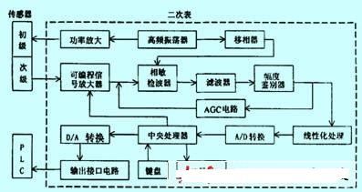 系統(tǒng)主要由傳感器和二次表組成。二次表主要由高頻振蕩器、可編程信號(hào)放大器、相敏檢波器、濾波器、幅度鑒別器、agc電路、線性化處理等電路構(gòu)成。本文就系統(tǒng)關(guān)鍵部分電路的原理及作用加以論述。