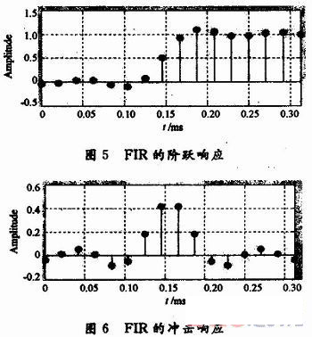 點擊“design filter”即可。值得注意的是,這里選擇filter order為15階,而不是所設計的16階濾波器。因為常數系數項h(0)=0。通過菜單“analysis”選擇“magnitude”和“phase response”即可得到圖3,圖4的特性顯示。“analysis”選擇“step response”和“im-pulse”可以得到圖5,圖6的響應顯示。可以看出所設計FIR濾波器的階躍響應和沖擊響應比較接近理想狀態。