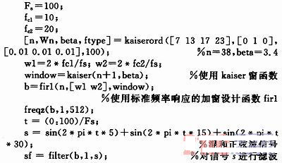 Matlab信號處理工具箱提供了各種窗函數、濾波器設計函數和濾波器實現函數。設計中利用Matlab提供的函數firl來實現,編程則是直接調用這些函數簡單直觀的完成設計。調用格式:firl(n,Wn,‘ftype’,Window),其中n為階數、Wn為截止頻率、ftype是濾波器的類型、Window是窗函數。應用凱塞窗的代碼如下: