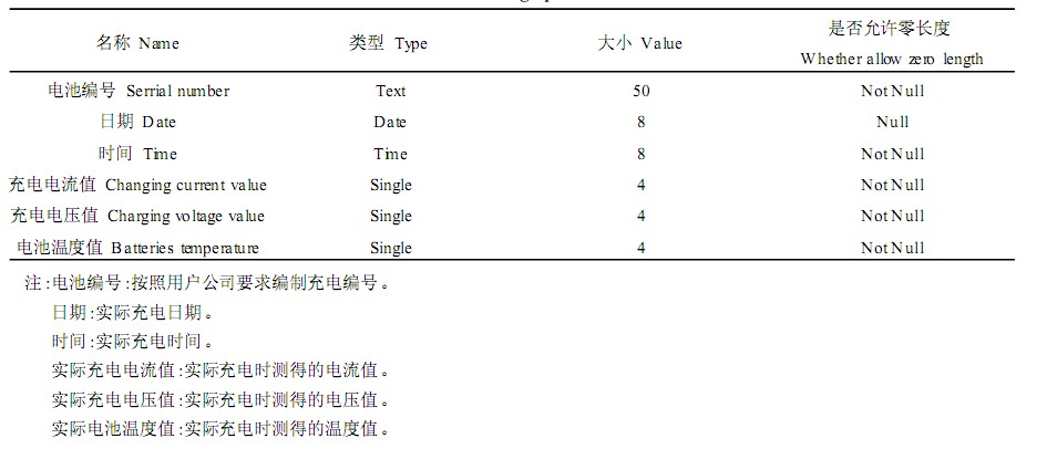 本系統(tǒng)設(shè)計了三個數(shù)據(jù)庫,用于標準充電曲線存儲、實際充電曲線存儲及分析結(jié)果存儲。使用VB6. 0提供的數(shù)據(jù)庫管理工具"可視化數(shù)據(jù)管理器"建立。其中實際充電曲線數(shù)據(jù)表如表1所示,數(shù)據(jù)庫的建立方便了對電池的查詢、分析,同時也方便了管理。