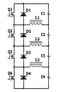 在均衡電路中,以4節(jié)電池為例,當對第二節(jié)電池均衡時,開啟MOS管Q2,蓄電池C2通過Q2給電感L1、L2充電,然后關(guān)斷MOS管Q2,則電感L1中的電流通過二極管D1回饋給蓄電池C1,電感L2中的電流通過二極管D3和D4回饋給蓄電池C3和C4,以達到各個單體均衡的效果。
