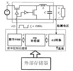 隨著數字芯片和電源技術的發展,現在出現了為電源控制而開發出來的控制處理器,它不同于數字芯片的中央處理器。控制處理器主要由高速AD轉換器,數字PID補償器和數字PWM輸出三部分組成。反饋環路的控制由它來完成,中央處理器作為管理模塊應用在電源上。其原理圖如圖3所示: