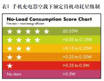 這些關(guān)注的結(jié)果是采取一系列措施來提升效率和降低空載功耗的需求。其中最新最嚴(yán)格的是由全球前五大手機(jī)廠商提出的一項自愿性的充電器星級制協(xié)定,用以標(biāo)志在充電完成之后,充電器仍插在壁式插座上時的耗能量。該星級制從0星級開始,最高5星級。空載下額定待機(jī)功耗大于0.5W的充電器為0星級標(biāo)簽,待機(jī)功耗小于0.03W(30mW)的為5星級(見表1)。通過比較,大多數(shù)現(xiàn)有手機(jī)的待機(jī)功耗在150~300mW范圍。