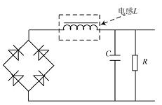 即功率因數(shù)校正( Pow er Factor Correct ion, PFC)是指有效功率與總耗電量( 視在功率) 之間的關系,也就是有效功率除以總耗電量( 視在功率) 的比值。無源PFC 是指不使用晶體管等一些有源器件組成的校正電路,一般情況下由二極管、電阻、電容和電感等無源器材組成。本文的PFC 主要是在整流橋堆和濾波電容之間加1 個電感, 具體原理如圖3 所示,利用電感上的電流不能突變的特性來平滑電容充電強脈沖的波動,改善電路中電流的畸變,并且利用電感上的電壓超前于電流這一特性來補償濾波電容電流超前電壓的特性, 使功率因數(shù)和電磁干擾都得以改善。