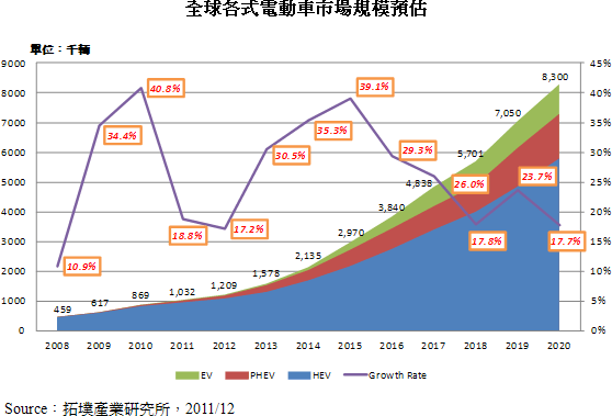 2020年前全球新能源車市場成長動能主要以油電混合車(Hybrid Electric Vehicle;HEV)為主,預(yù)計目前仍為全球電動車銷售上升主力,約占整體電動車市場70%。2011年后隨著鋰電池技術(shù)漸趨成熟,插電式油電混合車(Plug-in Hybrid Electric Vehicle;PHEV)市場逐漸起飛,2012年起將呈顯著成長,2020年銷售量將達(dá)150萬輛,占整體電動車市場的18%,而完全仰賴電池做為動力來源的純電動車(Battery only Electric Vehicle;BEV),由于各國政策推動期程不一,現(xiàn)仍處于示范運(yùn)行階段,預(yù)計2020年占整體電動車市場的12%。