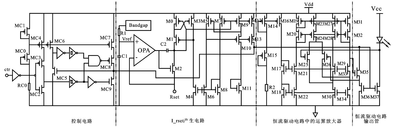 可以看出,圖1中(c)的結構可以實現顯著降低恒流工作電壓的目的。總體電路中的恒流驅動模塊采用該結構。