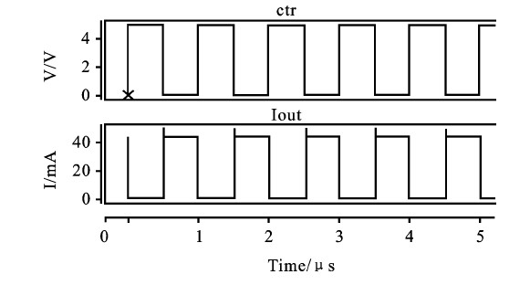 控制ctr信號變化時驅動電流變化情況如圖3.結果顯示ctr對驅動電流具有輸出使能控制作用,測量得到控制信號ctr響應時間僅為7ns.