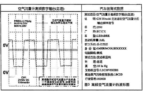 高頻數(shù)字式空氣流量計出現(xiàn)在通用汽車3.8L V6型發(fā)動機上,它是日立(Hitachi)生產(chǎn)的傳感器。此外,高頻數(shù)字式空氣流量計還應用于凌志(Lexue)以及其它汽車中。傳感器的脈沖大多數(shù)幅值為5V,怠速時頻率:2.77kHz。