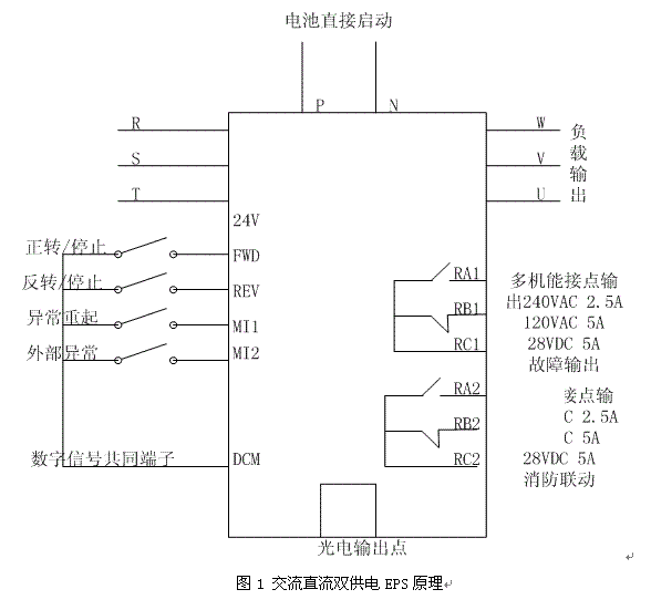 目前EPS采用的控制方式和控制手段不同,針對EPS所帶的負載可以歸納三種:一是主要用于應急照明和事故照明的EPS;二是除了應急照明、事故照明之外,還有應用于空調、電梯、卷簾門、排氣風機、水泵等混合負載的三相系列EPS;三是直接給電動機供電的變頻系列EPS。本文介紹的是最全面的混合負載三相系列EPS供電。