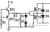 關(guān)互補(bǔ)電路實(shí)際上是繼電器的一個(gè)旁通電子開關(guān),采用兩只IGBT、兩只二極管構(gòu)成的交流通路,是互補(bǔ)式交流穩(wěn)壓器的主要技術(shù)點(diǎn),電路如圖3: