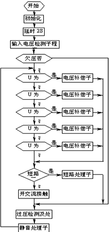 系統(tǒng)接通市電,合上電源開關(guān)后,單片機(jī)進(jìn)行初始化,延時(shí)2秒后,進(jìn)行輸入電壓檢測,若輸入電壓在允許范圍內(nèi),則根據(jù)電壓值進(jìn)行相應(yīng)的電壓補(bǔ)償,否則補(bǔ)償電路不進(jìn)行任何動(dòng)作,但要相應(yīng)的聲光告警;電壓調(diào)整完畢達(dá)到輸出標(biāo)準(zhǔn)后,自動(dòng)合上輸出交流接觸器,系統(tǒng)正常輸出。此時(shí),單片機(jī)對(duì)輸出電壓進(jìn)行過壓檢測,一旦輸出電壓過高,則切斷輸出,以防輸出電壓過高而影響負(fù)載工作,在電壓恢復(fù)正常后,自動(dòng)合閘,輸出電壓。單片機(jī)還對(duì)輸入電壓進(jìn)行實(shí)時(shí)檢測,只要市電發(fā)生變化,就進(jìn)入相應(yīng)的電壓補(bǔ)償子程序,對(duì)補(bǔ)償電壓進(jìn)行調(diào)整。其流程圖見圖5。