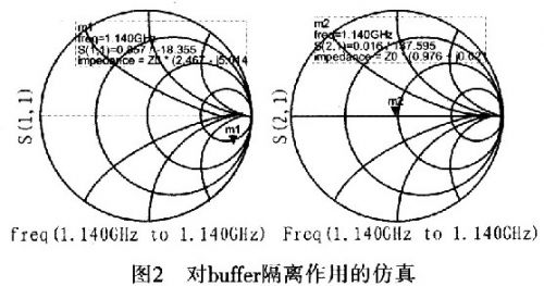 圖2是對buffer隔離作用的仿真。通過仿真發現:壓控振蕩器與外部電路相接時,外部電路阻抗的變化不會對壓控振蕩器的阻抗產生影響。