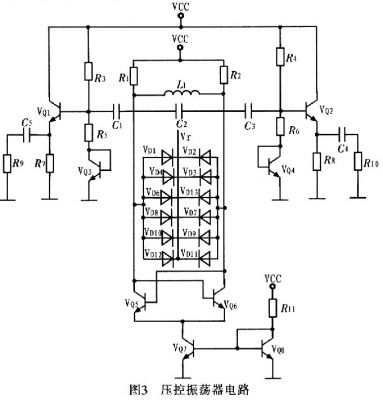 壓控振蕩器按構成原理可分為反饋型振蕩器和負阻型振蕩器2大類。這里采用負阻型振蕩器,其主要是由負阻器件和諧振回路組成的振蕩器,利用負阻器件的負電阻效應與諧振回路中的損耗正電阻相抵消,維持諧振回路的穩定振蕩。圖3為壓控振蕩器電路。