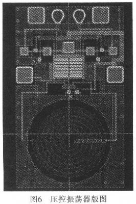 利用安捷倫公司的ADS軟件對電路進行仿真,從圖5可看出壓控振蕩器在控制電壓為1.98~3.98 V變化時,振蕩器調諧范圍為1.14~1.18GHz。圖6為壓控振蕩器電路版圖。