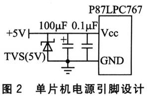 單片機(jī)工作電源和系統(tǒng)其他電路電源分開設(shè)計,避免其他電路對單片機(jī)工作電源產(chǎn)生影響,單片機(jī)工作電源設(shè)計留有足夠的余量,防止電源的波動影響單片機(jī)工作。在設(shè)計PCB板時,在單片機(jī)電源引腳接電容和瞬態(tài)電壓抑制器(TVS),如圖2所示。100 μF電解電容存儲的能量在電源波動時(降低)釋放出來,保持電源穩(wěn)定;0.1μF的高頻電容可以吸收電源上的高頻干擾;TVS吸收瞬態(tài)浪涌功率,使兩極間的電壓箝位于一個預(yù)定值,保持單片機(jī)工作電源穩(wěn)定。