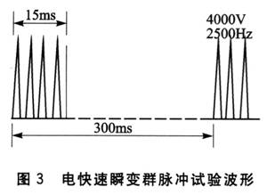 由于閃電、接地故障或切換電感性設(shè)備而引起的信號參數(shù)產(chǎn)生瞬時擾動,產(chǎn)生的高頻干擾信號主要是通過系統(tǒng)進(jìn)線電源進(jìn)入系統(tǒng)內(nèi)部。檢測這方面的抗干擾能力,主要是通過“電快速瞬變脈沖群抗擾度試驗”驗證。根據(jù)低壓電器產(chǎn)品試驗標(biāo)準(zhǔn)要求,試驗時在供電輸入端疊加頻率為2 500 Hz,幅度4 000 V的群脈沖,分別進(jìn)行相線、地線的差模、共模,正極性、負(fù)極性試驗,每項試驗時間均為1 min,群脈沖的波形如圖3所示。如果在“電快速瞬變脈沖群抗擾度試驗”過程中保護(hù)器不產(chǎn)生誤動作,則這方面的抗干擾能力就是合格的。