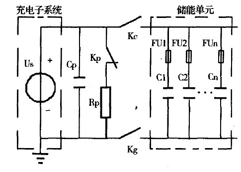 通常,充電子系統(tǒng)內(nèi)部配有過電流、過電壓和過熱等故障保護或異常告警裝置。但這些裝置的保護范圍一般僅限于充電子系統(tǒng)內(nèi)部,PPS放電時浪涌電壓等外部因素仍可能造成充電設備損壞。因此,在儲能單元和充電子系統(tǒng)間還需配置一些隔離和保護電路。圖1給出了用于ETCG研究的PPS所配置的充電隔離及保護電路。圖1中,充電隔離開關(Kc)和地絕緣隔離開關(Kg)在充電結束后打開,用以防止PPS放電時由負載等因素產(chǎn)生的浪涌高電壓通過充電子系統(tǒng)對地放電,可以避免因此所造成的充電設備絕緣損壞;充電輸出終端并聯(lián)了一小容量電容器(Cp)及其安全釋能電路(開關Kp、電阻Rp),目的在于防止空載誤充電,以避免在此情況下充電電路末端電壓急劇升高損壞充電設備。