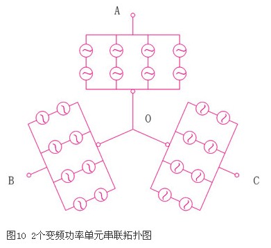 圖10所示的是1/4全電壓等級(jí)3.3kv的拓?fù)鋱D:由2個(gè)變頻功率單元串聯(lián)組成1個(gè)變流鏈,每相由4個(gè)變流鏈相并聯(lián),實(shí)現(xiàn)3.3kv等級(jí)的三相交流恒功率5000kva輸出。