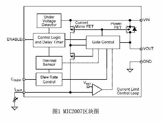 圖1展示了MicrEL公司MIC2007型限流配電開關(guān)圖例。