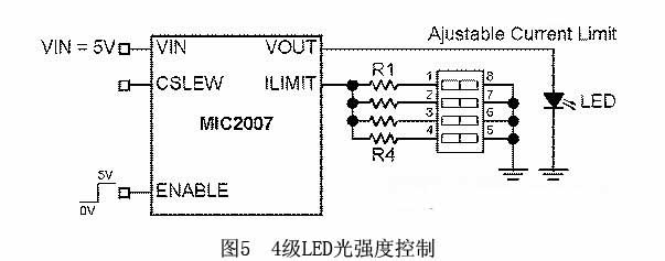 MIC2007可以在開關(guān)開啟且LED已點(diǎn)亮之后調(diào)節(jié)限流值。而通過(guò)改變限流值,就可以動(dòng)態(tài)調(diào)節(jié)LED的光強(qiáng)度。如圖5所示,有4個(gè)電阻器連接到Ilimit管腳。