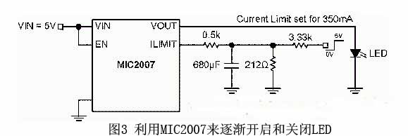 圖2展示的是輸出和LED相連的配電開關(guān)。MIC2007可以在2.5V-5.5V的輸入電壓下工作。它是通過(guò)外置電阻器Rset來(lái)設(shè)定限流值的。限流值等于CLF/Rset,CLF為限流因數(shù),一般是245(請(qǐng)參考MIC2007數(shù)據(jù)表暨電氣性能表),而Rset 則等于0.7 kΩ。因此,限流值就是245/0.7 kΩ = 350 mA。