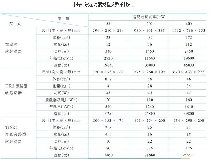 目前市場上流行的三種類型軟起動器:在線型、旁路型、內置旁路型。在線型軟起動器基本上是國外品牌,市場上的用量份額大約占到了1/4,都是些形象工程和無知工程,大約有1/2以上的采用旁路型軟起動器。從2003年內置旁路型面世后,開始普及內置旁路型軟起動器。通過上述的介紹內置旁路型軟起動器的技術先進性,讀者已有了一個理性的認識,下面筆者用數據比較來達到量化分析,如附表所示。附表中的造價是指廠家的公開報價,用戶的采購價一般都低于此價格。