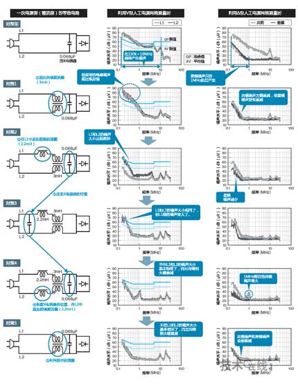 為了修正這種不均衡,我們③試著改變了X電容的位置。這樣一來,L1的噪聲增大了,L1和L2的噪聲大小變得基本一樣。但這并不能解決問題。因此,作為消除不均衡的其他方法,我們④恢復了X電容的位置,在L2中追加了差模扼流圈(2.2mH)。也就是說,在L1和L2中分別安裝了差模扼流圈。這次,不但L1和L2的噪聲大小基本相同了,而且全部大幅衰減。不過又出現了一個新問題,那就是1MHz附近的共模噪聲增加了。