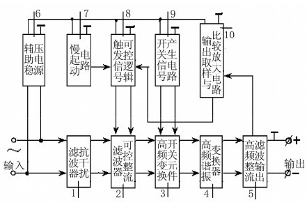如圖1所示,它由抗干擾濾波器1、可控整流濾波器2、高頻變換開關元件3、高頻諧振變換器4、高頻整流濾波輸出5依次連接而成。可控整流濾波器2的導通角的控制由觸發信號控制邏輯8完成。慢起動電路7使觸發信號控制邏輯8在開機時的導通角由零度逐步上升。輸出取樣與比較放大電路10,將高頻整流濾波輸出5的輸出電壓與基準電壓源相比較且進行放大,從而控制觸發信號控制邏輯8,使輸出電壓穩定。改變基準電壓源的大小,就能改變觸發信號控制邏輯8的觸發導通角,從而調節輸出電壓的大小。開關信號產生電路9產生一個適合高頻諧振變換器4的方波信號,用來控制高頻變換開關元件3的導通和截止,使直流電能進入高頻諧振變換器4,形成高頻電流震蕩;并經高頻變壓器輸出至高頻整流濾波輸出5,減小了開關噪聲。輔助穩壓電源6給慢起動電路7、觸發信號控制邏輯8、開關信號產生電路9、輸出取樣與比較放大電路10提供能量和基準電。