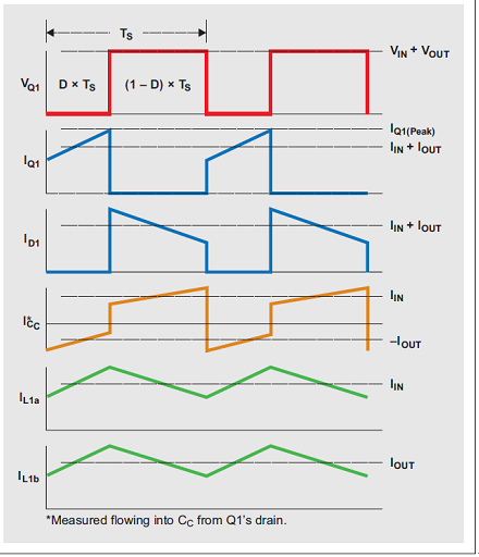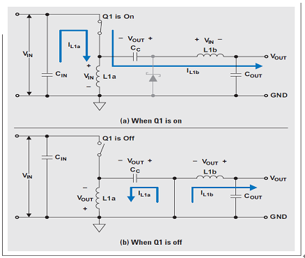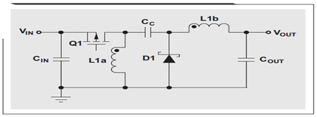 Q1 關(guān)閉時,L1b 的電壓必須為 VOUT,因為其與 COUT 并聯(lián)。由于 COUT 被充電至 VOUT,因此 Q1 關(guān)閉時 Q1 的電壓為 VIN + VOUT;這樣一來, L1a 的電壓便為相對于 Q1 漏極的 –VOUT。Q1 開啟時,充電至 VOUT 的電容 CC 與 L1b 串聯(lián);因此 L1b 的電壓為 +VIN,而二極管 D1 的電壓則為 VIN + VOUT。